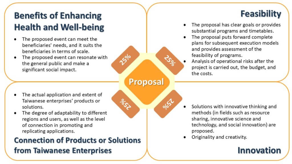 Welcome to the “Go Healthy with Taiwan” proposal campaign! This campaign aims to build a healthier future together with Taiwan. We sincerely invite you to submit your proposals to enhance the health and well-being of your cities, local communities, and businesses, and to generate cooperation. Selected proposals will be matched with Taiwanese enterprises to foster collaboration and create shared value.